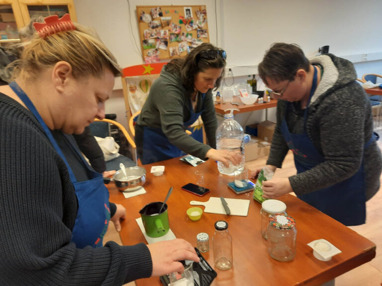 A marcali natúrkozmetika szakkör résztvevői a legutóbbi foglalkozáson elsőként a mosógél készítésével ismerkedtek meg. A szakkörösök már rutinosan melegítették a mosószappanos alapot és adagolták a