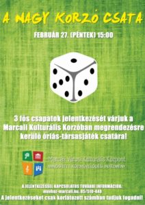 A Marcali Városi Kulturális Központ olyan civil szervezetek, egyesületek csapatainak nevezését várja, akik szívesen részt vennének az intézmény által szervezett Nagy Korzó Csata elnevezésű óriás-társasjáték