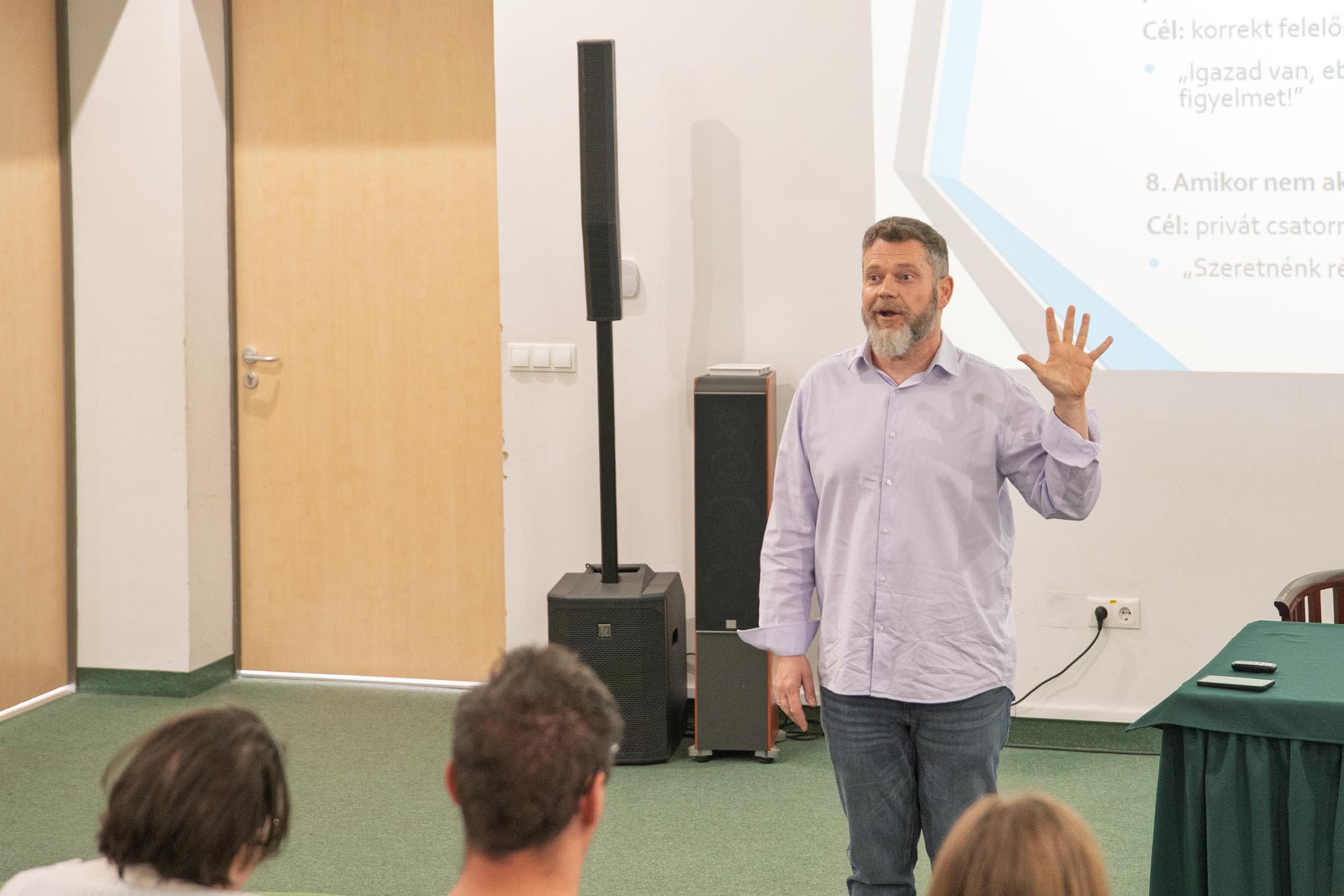 „Sem megerősíteni, sem cáfolni…” Kezdésként Forró Tamás kommunikációs szakértő avatta be a közművelődési szakembereket abba, hogy milyen a socialmedia válságkommunikáció, azaz hogyan lehet kezelni a negatív kommenteket.